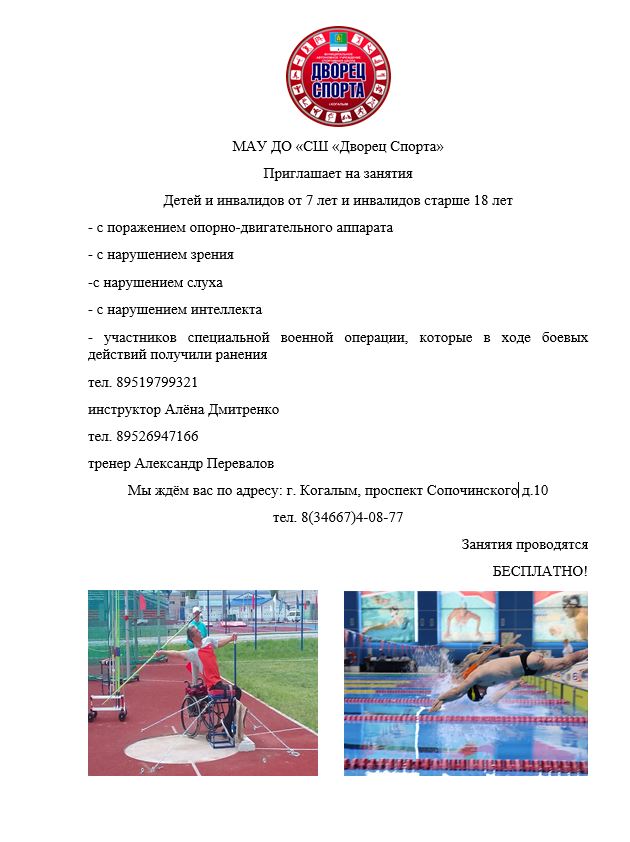 МАУ ДО «СШ «Дворец Спорта» приглашает на занятия Детей и инвалидов от 7 лет и инвалидов старше 18 лет