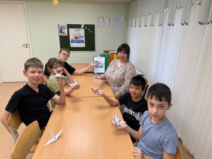 Специалист по социальной реабилитации Шумилова Елена Александровна и дети, посещающие группу «Робинзоны» отделения социальной реабилитации и абилитации детей с ограниченными возможностями БУ «Когалымский комплексный центр социального обслуживания населения», поддержали акцию «Белые журавли». Ребята прослушали стих поэта Расула Гамзатова «Журавли», познакомились с историей праздника и узнали почему журавль является символом памяти. После, под музыкальное сопровождения журавлиного курлыканья, дети изготовили белых бумажных журавликов в техники «Оригами».