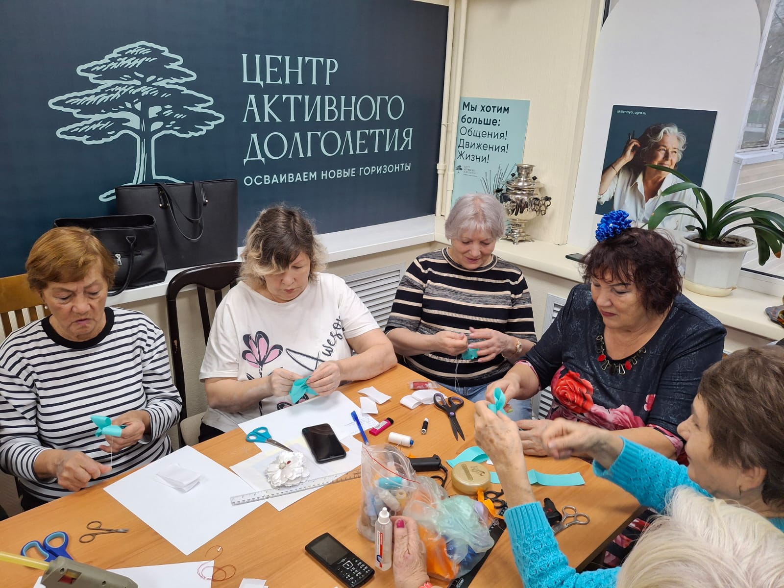 Затем последовал практический этап. Любовь Ивановна подробно объяснила основные приемы и тонкости работы с атласными лентами, клеем и фурнитурой. Под ее чутким руководством участники принялись за дело, шаг за шагом превращая простые лоскутки в изящные лепестки. В воздухе витал аромат клея и позитивной энергии творчества.