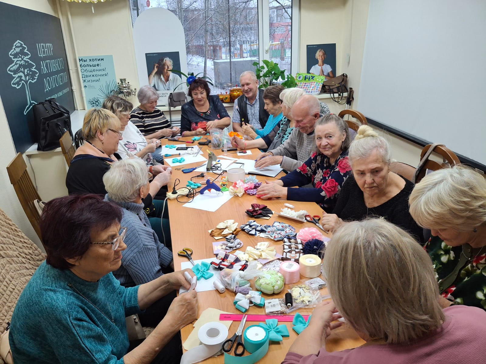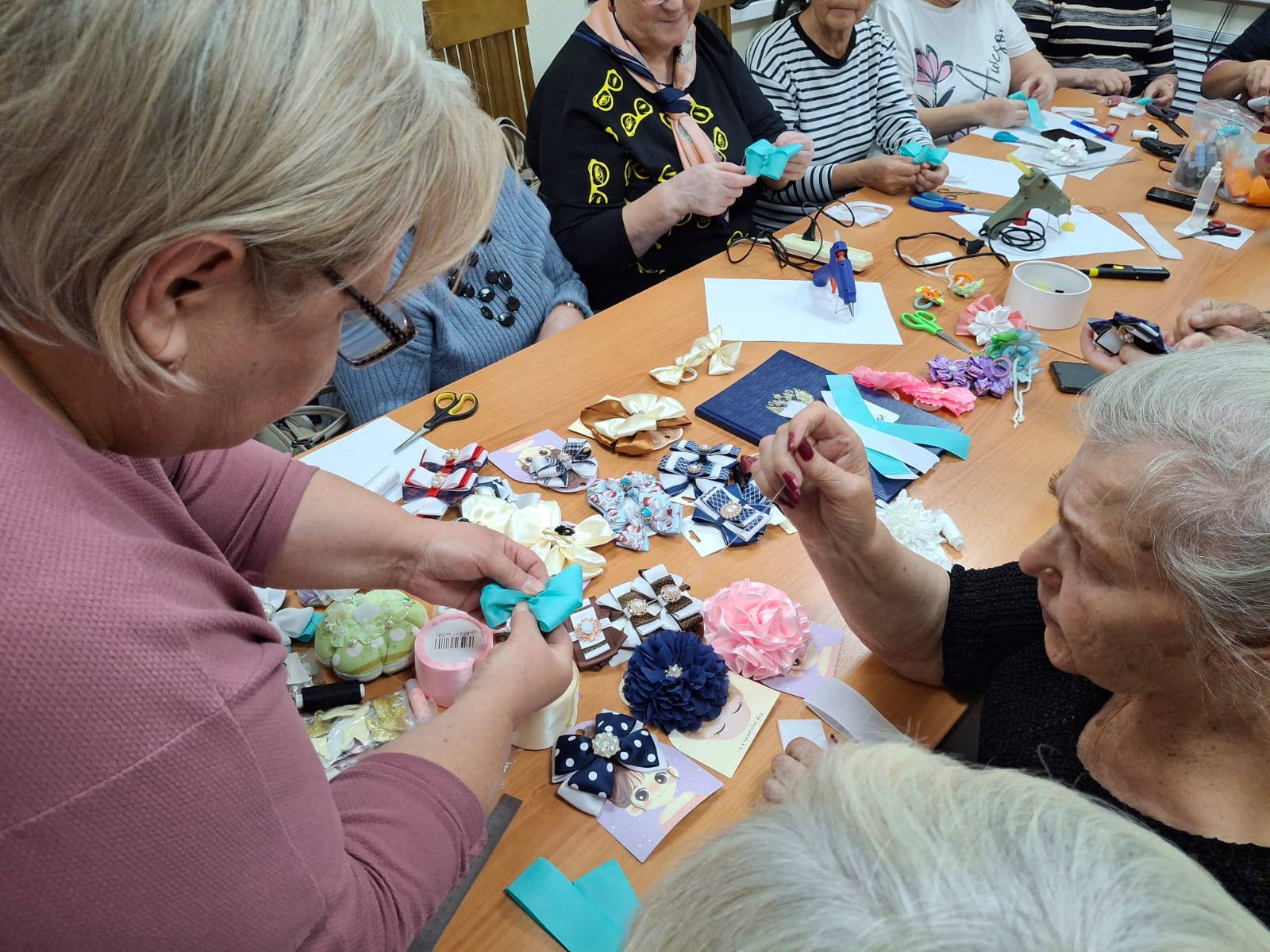 Затем последовал практический этап. Любовь Ивановна подробно объяснила основные приемы и тонкости работы с атласными лентами, клеем и фурнитурой. Под ее чутким руководством участники принялись за дело, шаг за шагом превращая простые лоскутки в изящные лепестки. В воздухе витал аромат клея и позитивной энергии творчества.