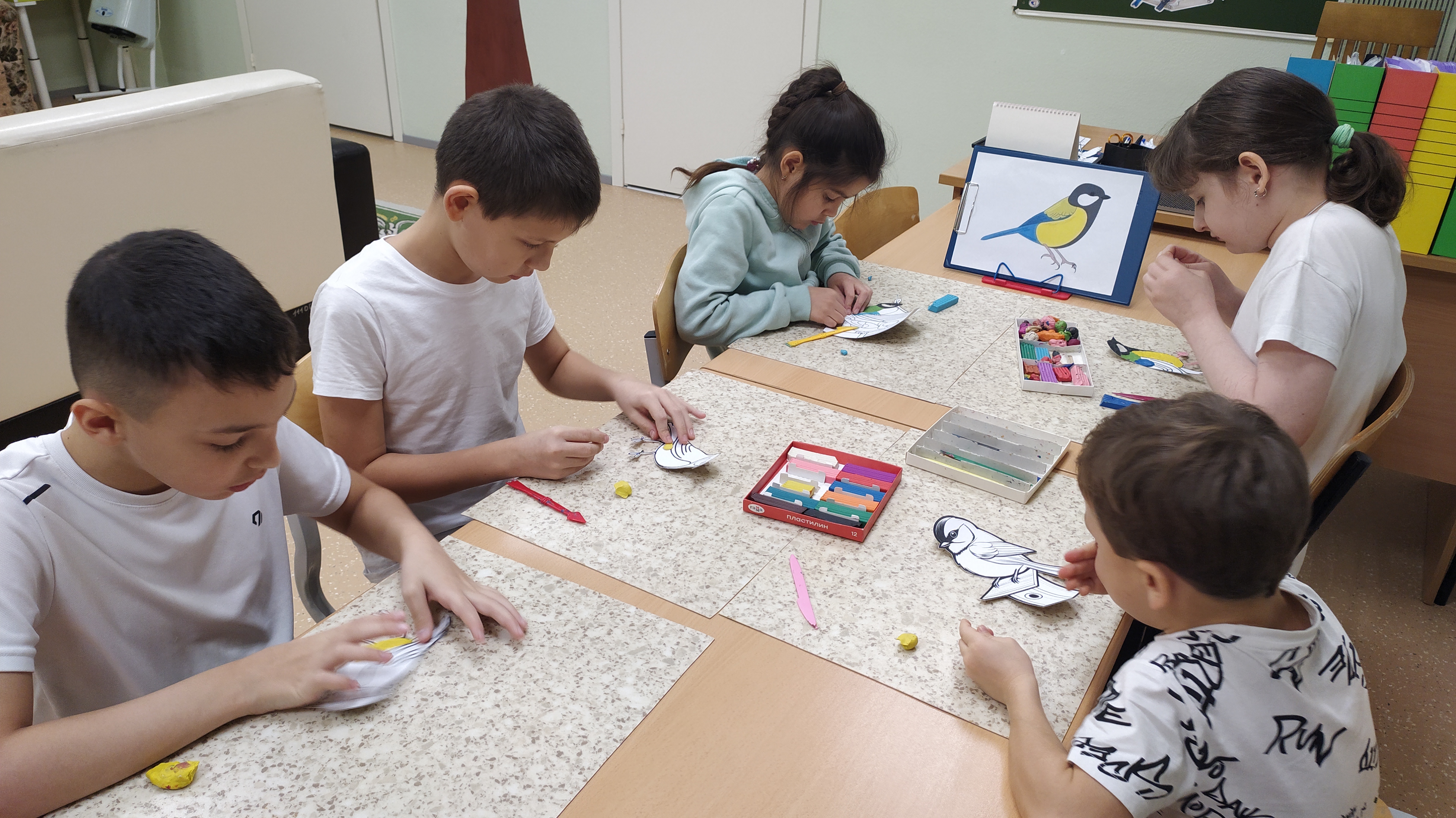 По случаю такого замечательного праздника дети, посещающие группу «Робинзоны» отделения социальной реабилитации и абилитации детей с ограниченными возможностями БУ «Когалымский комплексный центр социального обслуживания населения», познакомились с историей праздника, народными приметами этого дня, пословицами про синицу, узнали чем можно кормить птиц, а чем категорически нельзя. И, слушая аудио звонкого пения синицы, напоминающее перезвон колокольчика «зинь-зинь», ребята изготовили неповторимый образ синички-невелички, используя фантазию и нетрадиционную технику лепки – пластилинографию, накладывая тонкий слой пластилина на картон. Дети использовали жёлтый, зелёный, синий, голубой, розовый, коричневый, белый и чёрный пластилин. В результате у ребят получились чудесные, яркие синички!