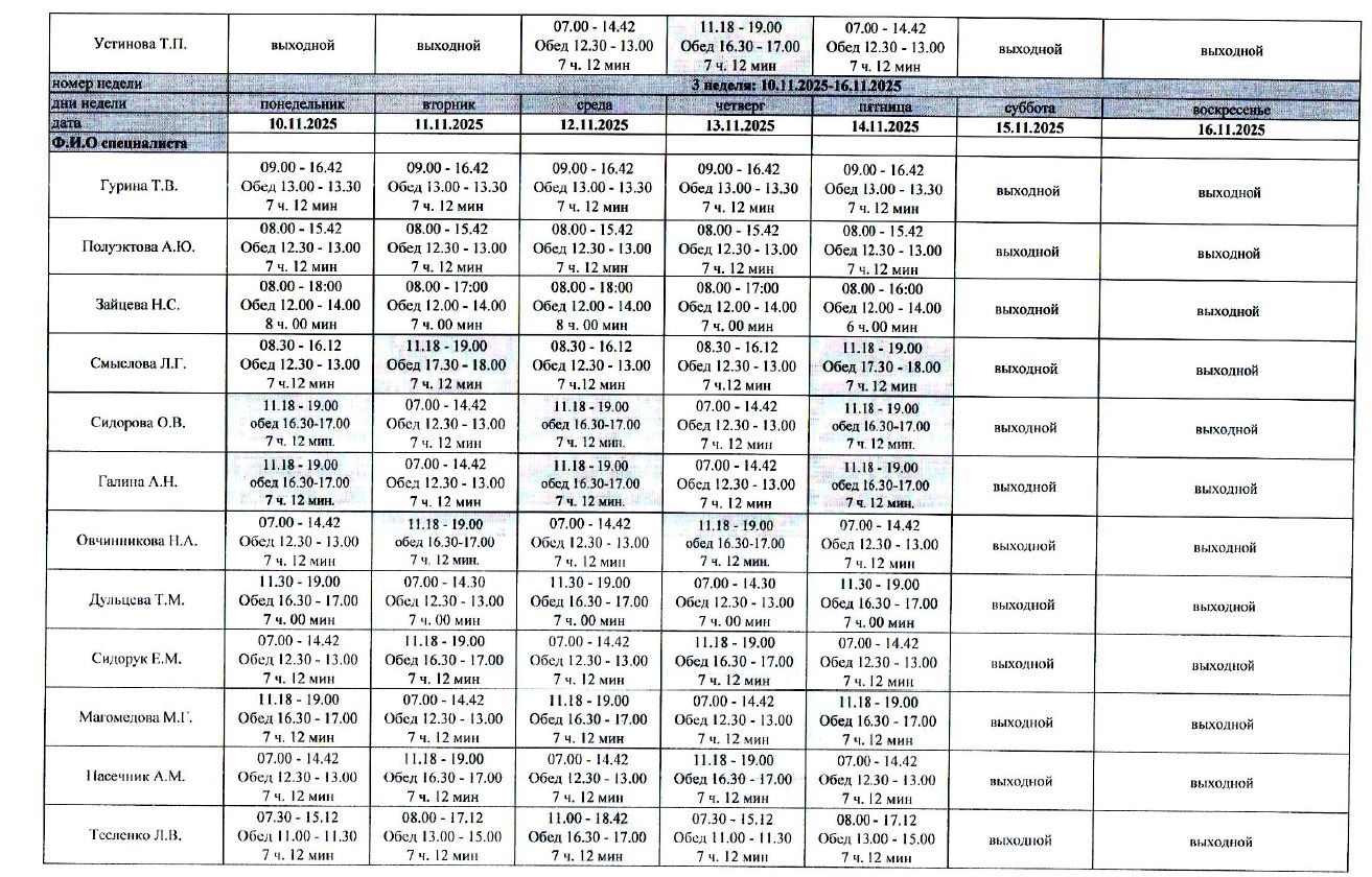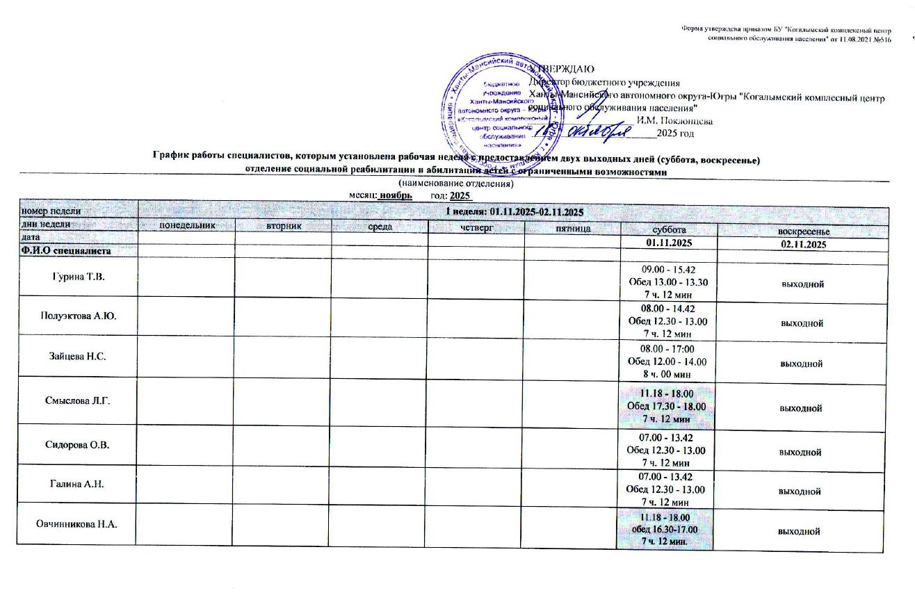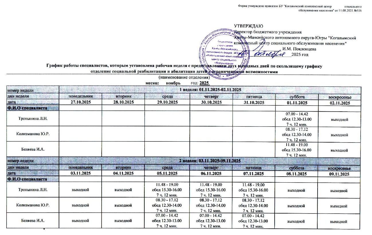ГРАФИК РАБОТЫ СПЕЦИАЛИСТОВ ОТДЕЛЕНИЯ СОЦИАЛЬНОЙ РЕАБИЛИТАЦИИ И АБИЛИТАЦИИ ДЕТЕЙ С ОГРАНИЧЕННЫМИ ВОЗМОЖНОСТЯМИ
